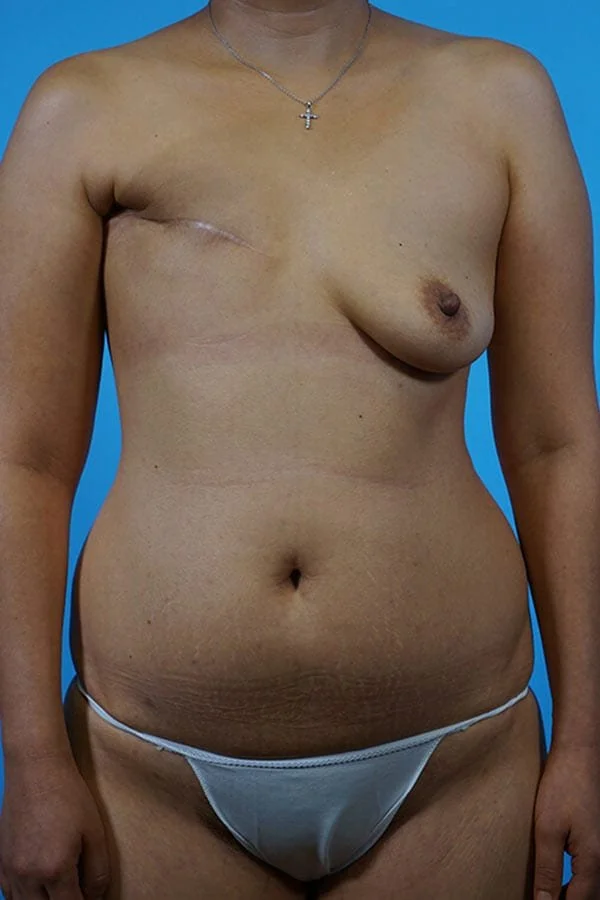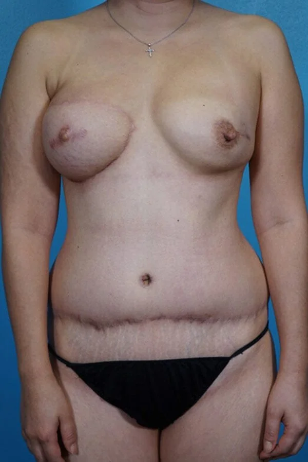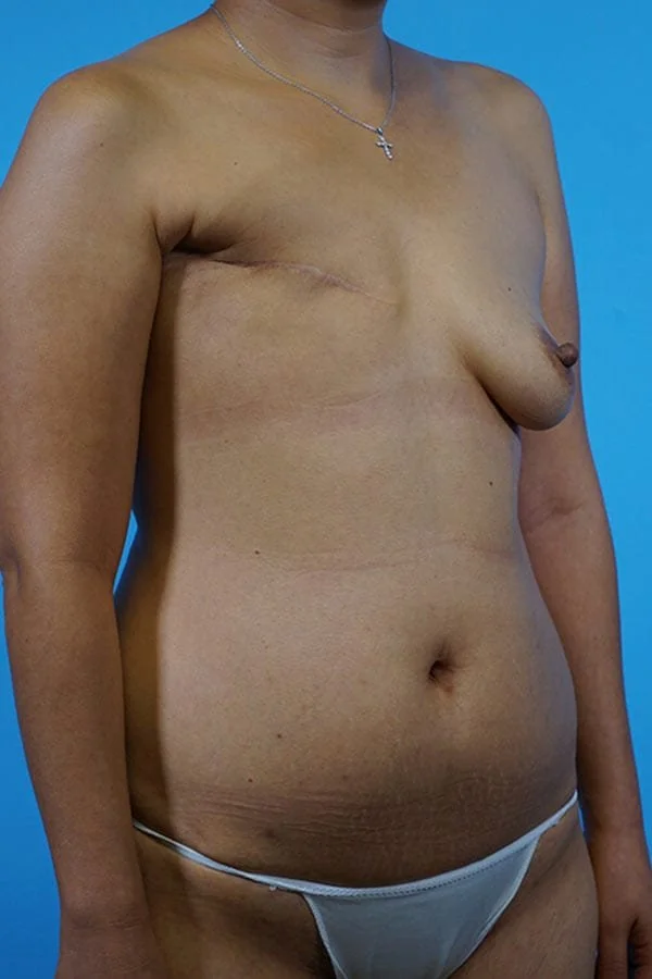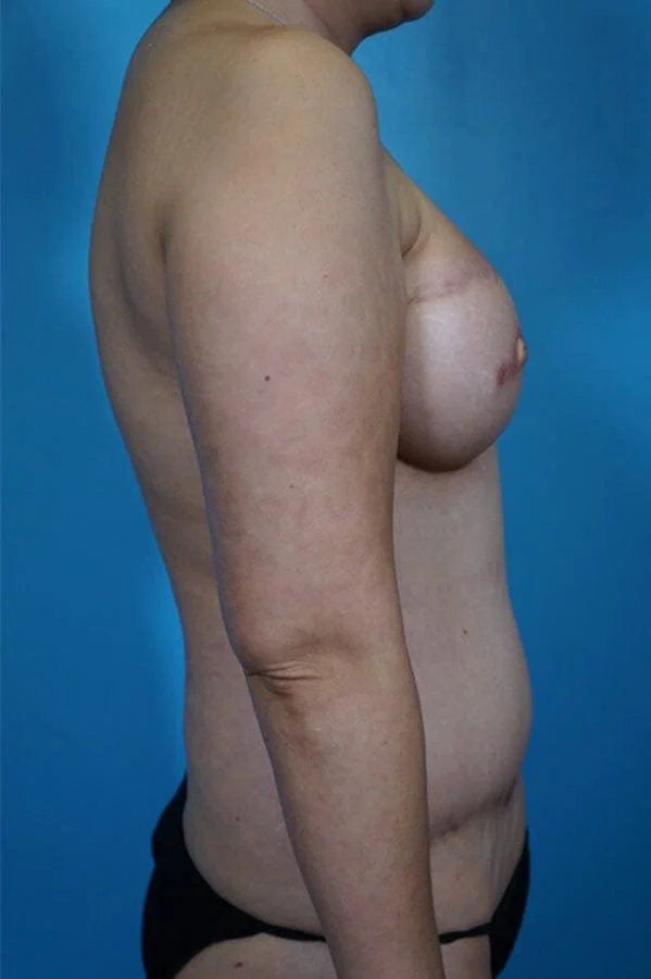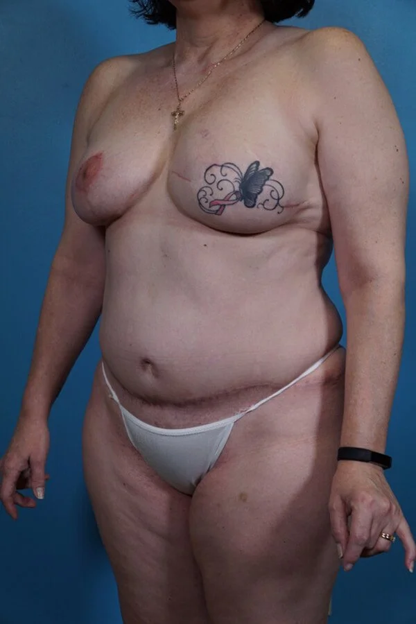 This 43 year old patient was treated for a right breast cancer with mastectomy, chemotherapy, and radiation therapy. She chose a secondary right DIEP flap and a prophylactic left mastectomy and immediate implant. She has had a right nipple reconstruction and tattooing will follow.