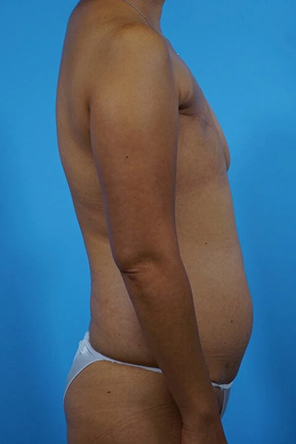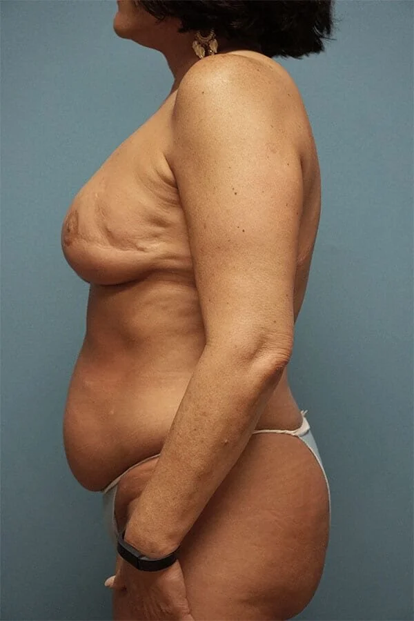 50 year old woman had a prior left mastectomy with an implant and subsequent pain. She elected to have her left implant removed and a DIEP flap with resolution of her pain. She chose to have a tattoo instead of nipple areola reconstruction and also had a right mastopexy for symmetry.